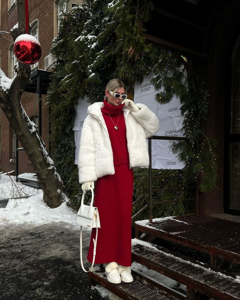 Stay warm, stay cute! A red turtleneck under a white sherpa jacket is the perfect Christmas day outfit for cold-weather celebrations. Add matching white boots and a mini bag for that soft, polished winter holiday look. This mix of red and white gives you that cozy Christmas fashion outfit vibe that’s both picture-perfect and seriously warm.