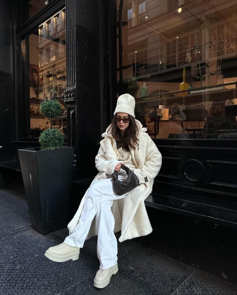All-white everything — and it totally works. This monochrome look with a long coat, wide-leg pants, and a cozy beanie screams winter elegance. It’s the perfect chic Christmas outfit for coffee dates, snowy strolls, or weekend getaways. Who says festive fashion has to be red and gold? Neutrals can be just as stunning — clean, classy, and full of holiday charm.