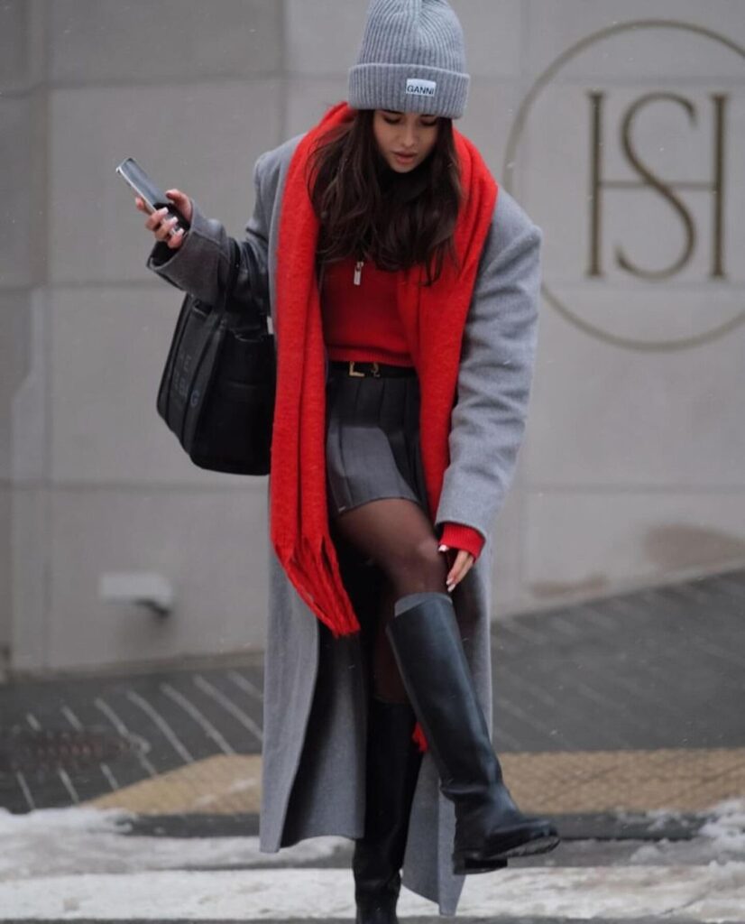 Who says cozy can’t be stylish? Layer a red sweater under a long gray coat with a matching scarf — it’s the ultimate holiday street style combo. Add a mini skirt and knee-high boots for that perfect winter balance of cute and comfy. This look is made for Christmas shopping days or holiday travel outfits when you wanna look put-together but still stay warm and cozy.