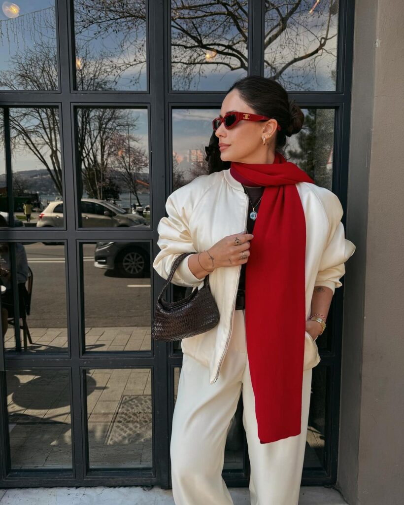 Clean, cozy, and super chic — a winter-white outfit with a bold red scarf is the ultimate Christmas brunch outfit. Add red sunglasses and a sleek bag for that modern, luxe twist. Perfect for holiday travel looks or festive street style, this combo gives classy and merry without even trying. It’s soft, stylish, and totally Instagram-ready.