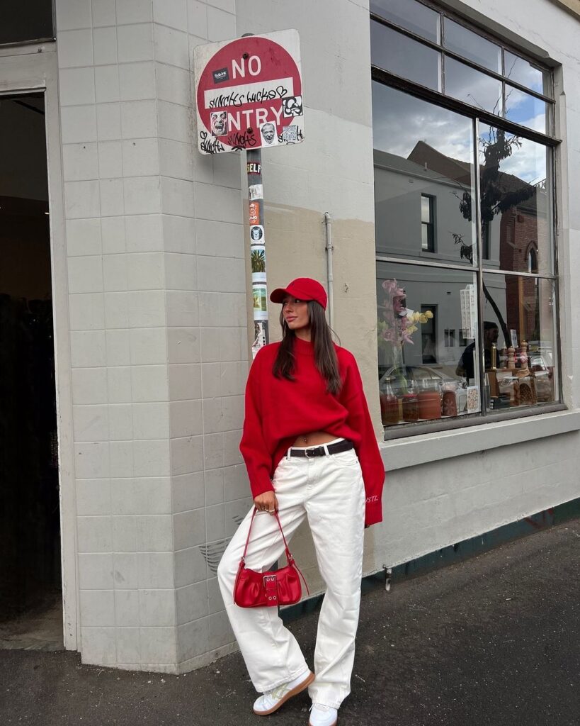 Keep it chill but festive with this laid-back red and white combo. Think oversized red sweater, white jeans, and a cute red cap — the perfect casual Christmas outfit for weekend hangouts or coffee runs. Throw on white sneakers and a mini red bag to tie it all together. It’s comfy, trendy, and gives off those cozy holiday street style vibes that everyone loves this time of year.
