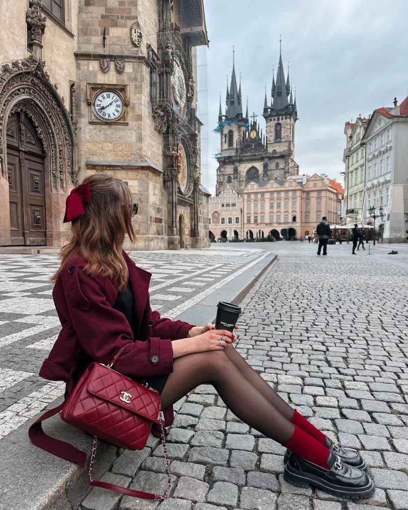 Heading to the city for the holidays? Try this chic burgundy look. The matching coat, mini skirt, and tights make it an elegant Christmas travel outfit idea that’s cozy yet sophisticated. Add a quilted bag and bow details for a soft feminine finish. This festive fashion outfit is timeless, stylish, and perfect for winter getaways or Christmas strolls downtown.