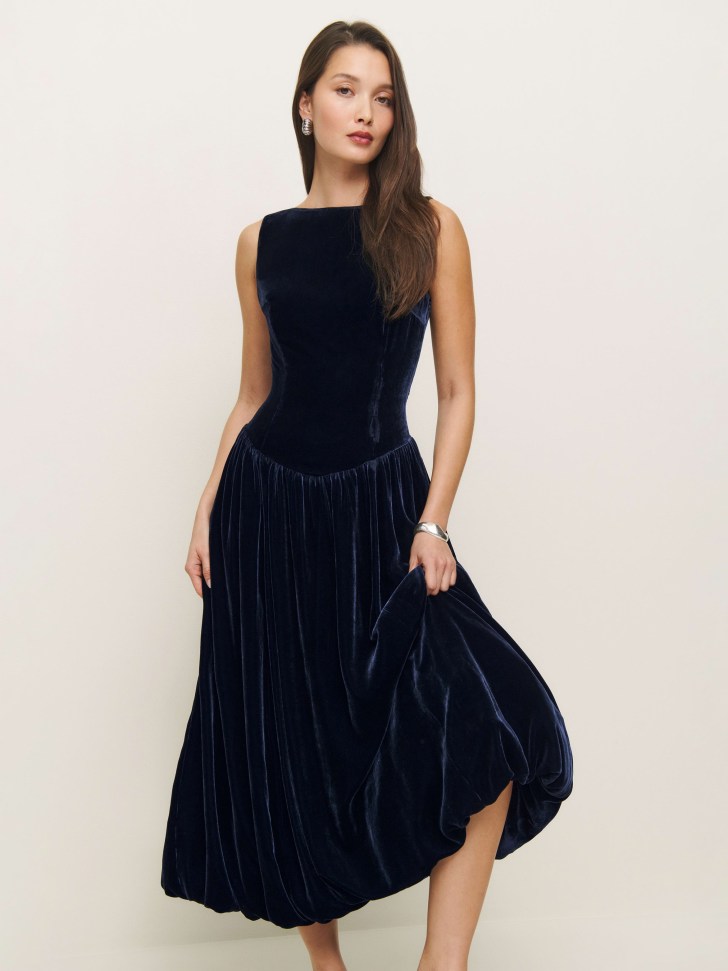 Bring the holiday sophistication with a stunning navy velvet dress that’s made for Christmas dinners or winter formal parties. The smooth texture and flowy shape make it timeless and so chic. Add silver heels, dainty jewelry, and a soft glam touch for a women’s Christmas outfit idea that feels elegant, expensive, and effortlessly stylish.